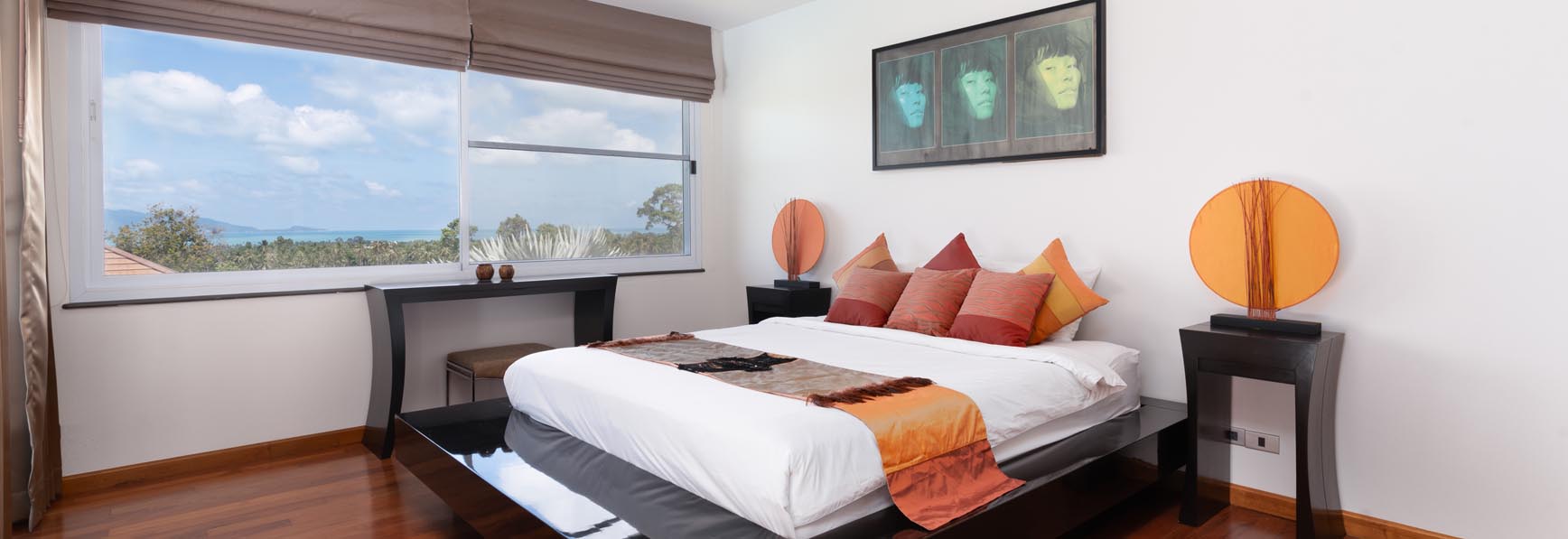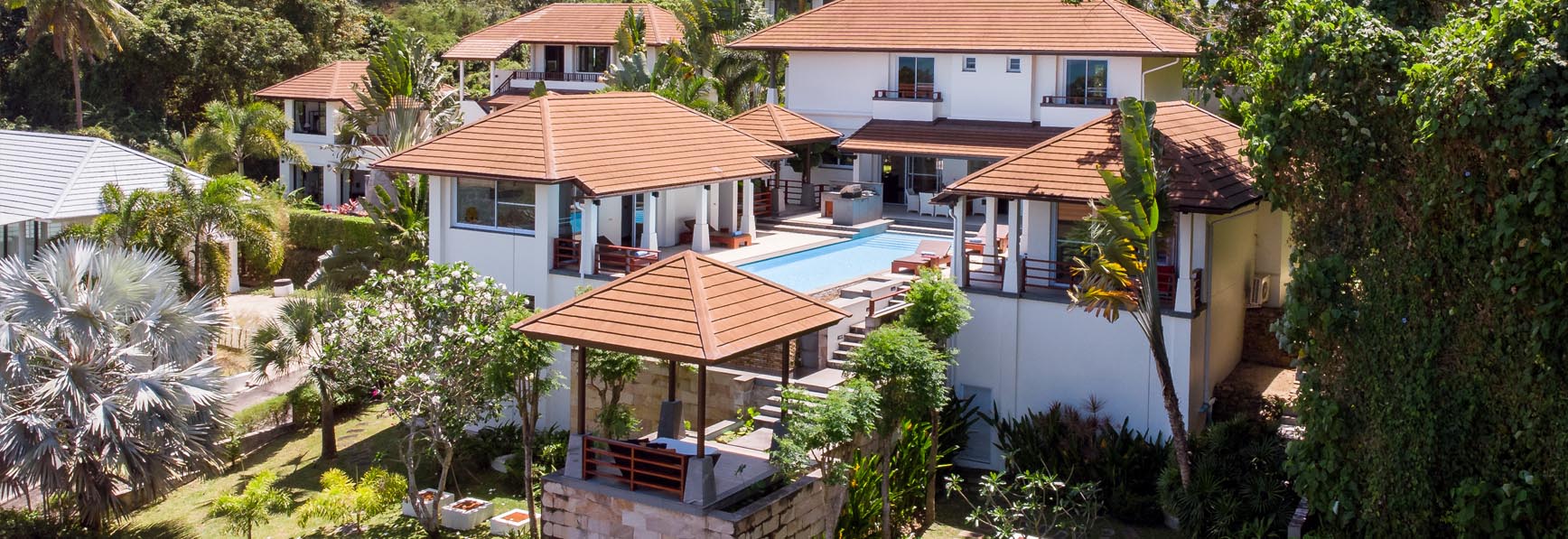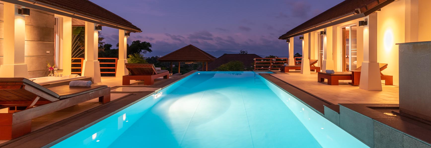 Villa Jantra [ moonlight ] is a unique and impressive 4 bedrooms pool villa in tropical island of Koh Samui which offers stunning views of the ocean and tropical jungle from within this private, secure located on the hills overlooking Meanam beach which is within a few minutes drive. Wireless Internet is provided and the villa is fully air-conditioned and covered parking is provided